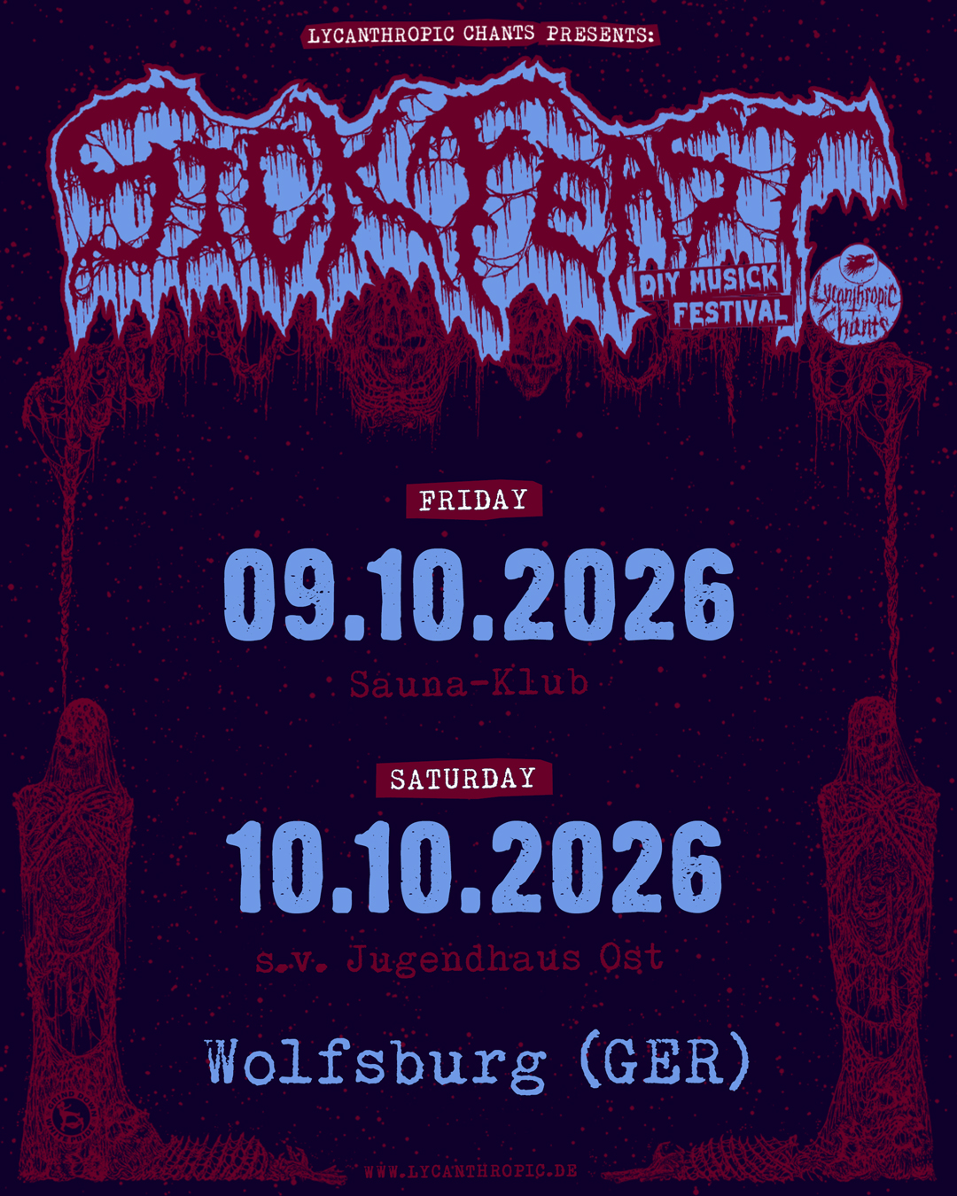 Lycanthropic Chants invites you to celebrate extreme underground musick at Sick Feast in Wolfsburg (Germany): A ghastly gathering of disgusting death that will grind your guts at s.v Jugendhaus Ost on 10th October 2026 and Sauna-Klub on 9th October 2026!