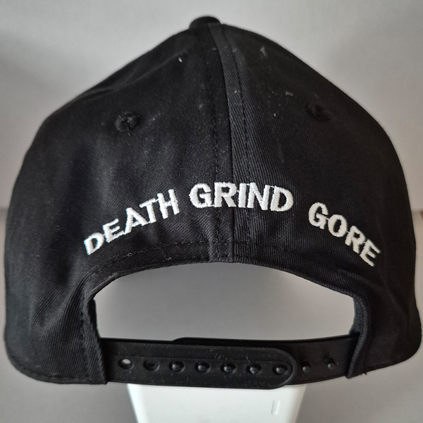 Black baseball cap with embroidered white logo on front and “Death Grind Gore” writing on the back.